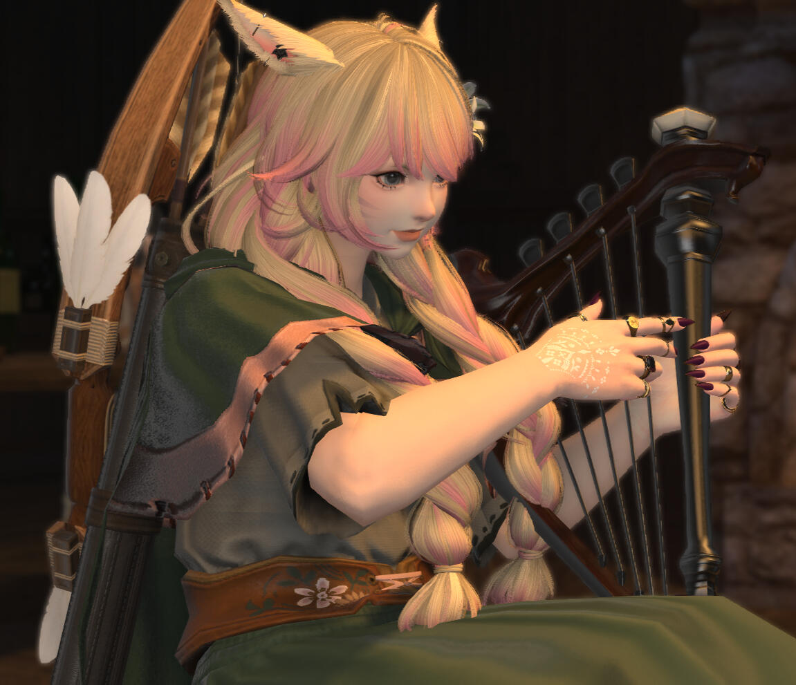 • clothing : whimsical and feminine, cozy, sometimes a tad flamboyant❝ || OVERVIEW : Hailing from the Keeper of the Moon clans of the South Shroud, Mixirri is a somewhat timid, eccentric young woman who never quite fit in with her family. Time spent at Buscarron's Druthers had her exploring her love of music and storytelling with travelling bards, encouraging her to pursue her talents and passions over merely doing what was expected of her in her clan no matter how miserable it made her. Thus, she fled to Gridania, freshly into adulthood, bow on back and harp in hand, with stories to tell. The forests of the Shroud will always be her home no matter her relationship to her tribe, but there's a world out there for her to see, rich with wonder and other songs to hear.And that's how it began, for this Warrior of Light. As we well know, things got a bit out of hand after that.